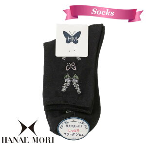 日本人初パリのオートクチュールデザイナー、ハナエモリのソックスです。 藤をあしらったエレガントなデザインは、女性をさらに美しく彩ります。 シルクプロテイン加工が施された履き口ゆったりタイプ。長時間の外出も快適です。 **