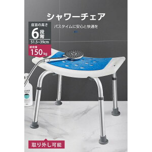 浴室用チェア 商品詳細 サイズ (約)幅52.5cm×奥行51cm×高さ71.5〜84cm(全体) 重量 (約)3.4kg 耐荷重 (約)150kg 素材 アルミニウム、ポリエチレン、EVA素材、ニトリルゴム 他 滑りにくいゴム脚 脚...