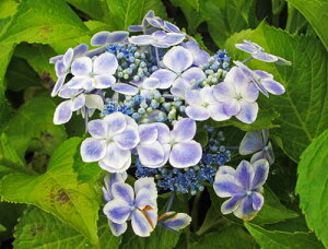 日本の古品種でホンアジサイの変異種です。 装飾花の縁が丸まって渦を巻くように見えることから『ウズアジサイ』と呼ばれ、可愛らしい雰囲気があります。 花は薄青色ですが、中性土壌でピンク色に咲かせたものは「梅花咲」と呼ばれて
