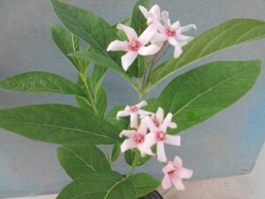 ガガイモ科多年草。 【規格】13cmポット、高さ35cm。 ※2本立ち。うち1芽には花芽がありません。 ※夏、タチバナに似た白い花を咲かせますが、本品はうすピンク色です。 ※写真は令和7年5月16日撮影。開花中。 ※日の丸のように写っ...