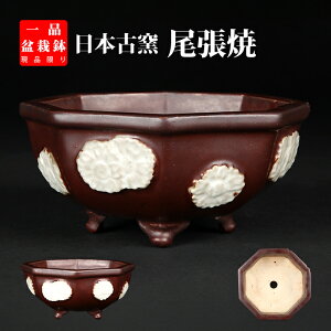 鉢の底から口にかけて大きく広がったソリ型の鉢です。三重県四日市市で作られる伝統的な万古焼は耐久性があり、屋外に野ざらしになる植木鉢にとっては大切なポイントです。