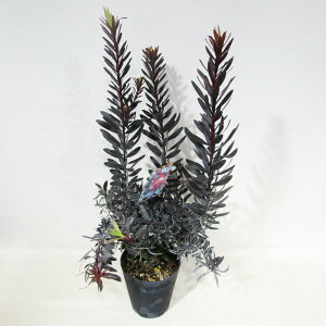 リューカデンドロンは鮮やかに色づく葉が魅力的なネイティブプランツ。早春のころ花が咲き、松ぼっくりのような種を付けます。茎の先端部の色付いた部分は苞葉(ほうよう)と呼ばれ、花を覆う葉が変化したものです。切り花アレンジの
