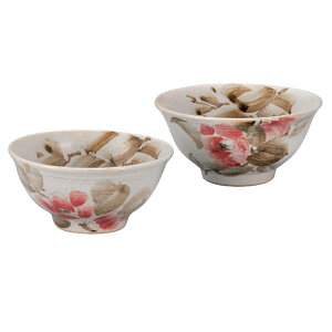 )。一つ一つ丁寧な手作業で高級感漂う雰囲気の夫婦茶碗です。 赤土に化粧を施し、全面に椿が絵付けされています。手描きと段々になっている器の形が相まって...