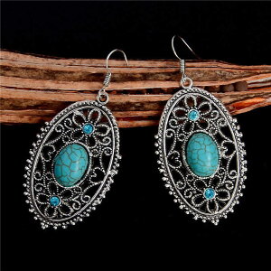 お花をデザインした楕円形の台座にトルコ石をセットしたステンレスピアス。ボヘミアンなスタイルをアシストしてくれるステンレスピアス。存在感のあるトルコ石がおしゃれ心をくすぐる。アンティークシルバーと鮮やかなターコイズがク