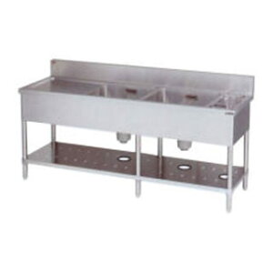 品名:三槽シンク・バックガードあり。●外形寸法(間口×奥行×高さ×バック):1800×600×800×150×60mm。●排水口:50A×3。●仕様:ゼンメンアール。