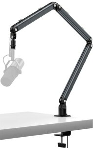 マイクブームアームは、マイクをデスクから浮かせて固定するためのアームです。これにより、デスク上の振動によるノイズ混入を抑えることができます。