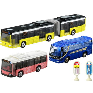 トミカタウンではたらくバスが3台セットになって登場!バス停標識の小物付きです。 [セット内容] ・メルセデスベンツ シターロ トミカタウン連節バス ・いすゞ エルガ トミカタウン路線バス ・日野セレガ...