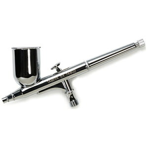 広い面積の塗装に適した0.5mmのノズル口径を採用したダブルアクションタイプのエアーブラシ。本体は精度が高く耐久性に優れた金属製。洗いやすい一体成形の塗料カップは大容量の15cc。(C)TAMIYA、...