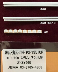 日本瓦向けの棟瓦・鬼瓦セットです。材質:スチレン・アクリル樹脂 *1/100サイズの日本瓦(PS-135)用です。*内容; ・MS-60(四角棒;1.5mm x 1.5mm x 長さ250mm)x 2本...