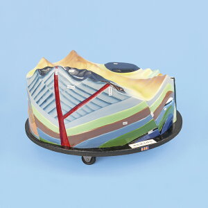 ●地殻の一部にひずみが生じ、その部分に割れ目が生じて断層ができ、さらに地層が力を受けて褶曲や整合・不整合ができることを説明できます。 ●火山による地層の変化も表現してあります。 【仕様】 材質:プラスチック(本体)、木(