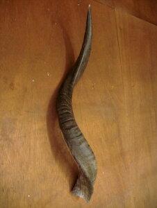 壁掛◆角装具■約68cmクーズーホーン1本:学名「Tragelaphus strepsiceros」 本場ナミビアより狩猟して輸入した本物のクーズーホーン(角)1本です。 ■お取り付けは、壁にネジや釘を入れて、そのまま後は取り付けてい...