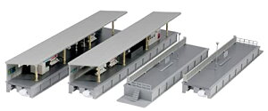 高架駅舎を中心に、高架駅店舗、高架駅プレートをセットして、20m級車両6両分の停車が可能な長さの高架駅。複線高架線路の発展・展開に最適。単線高架線路とも連結可能。 接着剤不要のイージーキット方式。窓サッシ部着色済み。高架駅