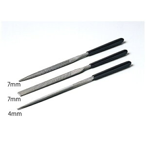プラスチックはもちろん、金属や各種素材の削り加工など模型や工作に幅広く使えます。平ヤスリと丸ヤスリ、半丸ヤスリの3本をセットしました。どれも長さ16cmのコンパクトサイズで取り回しがしやすく、細かい部分の加工にも最適。グリ