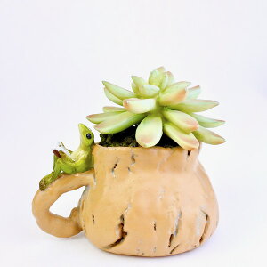 ーン♪ 仕様 【サイズ】■全体サイズ:幅10cm×奥行7.5cm×高さ7.5cm【素材】 ■材質:樹脂(われものです) コメント ■多肉植物と読書するカエルさん!アンティーク風なカップの持ち手に座りながら...