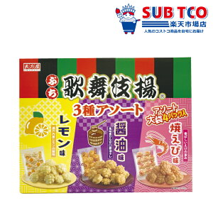 3種類の歌舞伎揚を詰め合わせたアソートBOX 醤油味」「焼えび味」「レモン味」3種類の味わいが楽しめます。 サクサクした食感の揚せんべい 1056g(264g×4パック)入りの大容量お徳用商品 食べきりサイズの個包装タイプ
