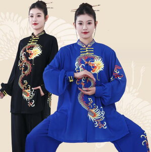 華やかな龍柄が施された太極拳服上下セット。 全6サイズx7色ドライ快適クール素材を使用。すばやく汗を吸いとり、吸収した汗も素早く乾燥。ゴムと紐でウエストサイズ調整可能。動きやすいので、太極拳や功夫武術・長拳・気功...
