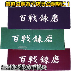 「百戦」は数多くの戦い。「錬磨」は練り磨くこと、よく鍛えること。多くの戦いにのぞんで武芸を鍛え磨くことをいう。 剣道用の面手拭では、定番&人気のデザインです。大きさも価格もちょうどいい♪