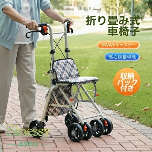【折り畳み式歩行車】高さ6段階調節可能で高齢者の日常生活をサポートし、さまざまなニーズに対応する。1.歩行補助 2.休憩用 3.車椅子 4.収納スペース 【折りたたみ可能・コンパクト】座面を持ち上げ、横棒を上に引き上げるだけで、簡単に...