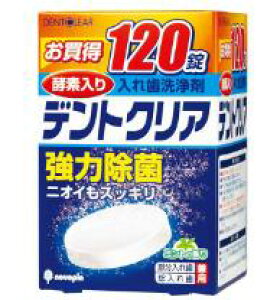 デントクリア 総入れ歯用 120錠の仕様●成分/酵素、界面活性剤(アルファオレフィンスルホン酸塩)、発泡剤(重炭酸塩、クエン酸、炭酸塩)、結合剤、流動改善剤、香料、色素、酸素系漂白剤(過硫酸塩)●生産国/日本デントクリア
