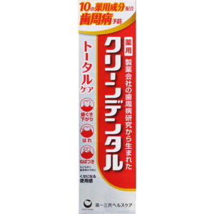 クリーンデンタル トータルケア 薬用はみがき【効能・効果】歯槽膿漏(歯周炎)の予防。歯肉炎の予防。歯石の形成及び沈着を防ぐ。むし歯の発生及び進行の予防。口臭の発生の防止。歯を白くする。タバコのヤニ除去...