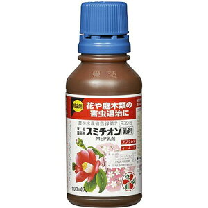 家庭園芸用スミチオン乳剤 内容量 100ml 特徴◆花や庭木類の害虫退治に草花・庭木・野菜や果樹などを加害する広範囲の害虫に効。