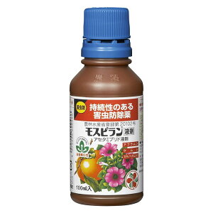 持続性のある害虫防除薬。カキの実を落とす「カキノヘタムシガ」の防除に。うめ、トマト、なす、ペチュニアにも。 [商品説明] ■農林水産省登録番号:第20102号 ■農薬の種類:アセタミプリド液剤 ■農薬の名称:モスピラン液剤 ■物理的