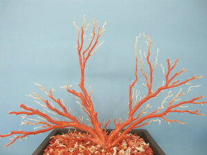 五島・奄美近海水深150〜300メートルで採取された桃珊瑚です。 桃色珊瑚は、日本近海の水深200〜500メートルのところで生育しています。 赤珊瑚より大きいものが多く、彫刻をほどこす、美術工芸品に利用されています。 豪華で枝ぶりの大変