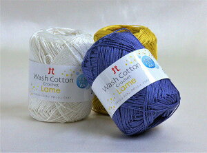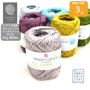ウォッシュコットンクロッシェラメ 1玉 品質構成:綿64%、ポリエステル36% 重量・長さ:25g玉巻(約96m) おすすめかぎ針:3/0号 かぎ針標準ゲージ:(長編み)28目・12段 春夏糸並太タイプの定番ウオッシュコット