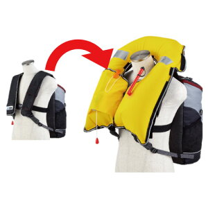 気室:ナイロン、リュック部分:ナイロン ●付属品:ヘルメット・ケミカルライト(12時間持続)・防水ケース(B5サイズ) ●本体サイズ:高さ58015;幅31015;奥行240mm ●重量:約1.45kg ●浮力:約20kg...