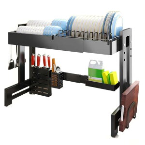 水切りラック 大容量 2段式 横置き 水切りかご 錆びない 省スペースディッシュラック キッチン収納棚 食器乾燥 大型食器収納ボックス 組み立て簡単 伸縮式 食器 水切り(黒-幅さ63-83CM-A)