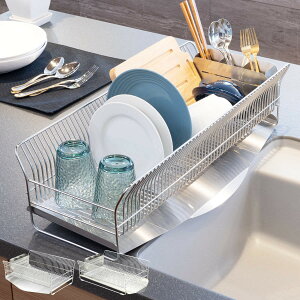 丈夫なオールステンレス製の水切りバスケットです。水切りトレーを斜めにすることで、水が自然に流れます。ワイヤー線を8mm間隔でつけることで、お皿も立てかけて収納でき、コップ等の小物も安定して置けます。