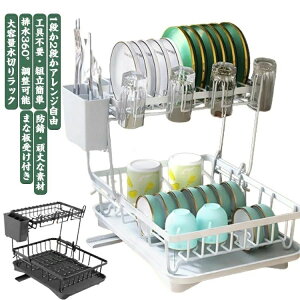 「メタル製2段式水切りラック」クロム加工が施された厚い金属で、錆びにくく、腐食に強いです。安定性に優れた、しっかりとした作りの 2 段食器ラックです。 「大容量の水切りラック」最大17枚の皿を収納できます。上段には食器を収納でき、下段...