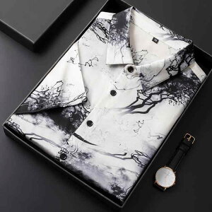タイプ: 開襟シャツ・フィット: レギュラーフィット・ネックライン: 襟付き・袖丈: 半袖・柄: 水墨画・厚さ: 薄手・加工: プリント・主な素材: シルク・素材構成: 桑蚕シルク92.4%、スパンデック
