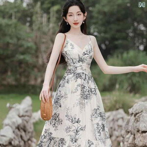 2点 セットの ストラップ ワンピースの 質感の ハイエンドの 水墨 画は 腰を 収めて やせている 中で 長い スカートの ビーチの スカートの レディース 海辺を 現します。生地名: シフォン/ポ...