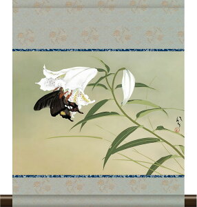 仕様 サイズ 掛け軸寸法:尺三立 約横44.5×縦164cm (少し小さいサイズです・幅の狭いお床用) 仕様 表装 : 洛彩緞子本表装 本紙 : 新絹本 軸先 : 陶器 化粧箱付き ※各アイコンの意味は、こちら 説明 きらび...