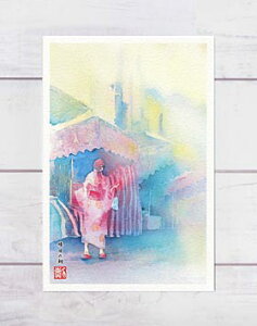 【 商品説明 】 縁日の屋台が並ぶ、祭の朝。 朝の陽射しの中、ゆかたを着た女性が歩いて行きます。 祇園祭、宵山の朝の光景を描きました。 ★透明水彩で描いた、優しい色彩のポストカードです。 夏のお便りにいかがですか♪ ※絵手紙