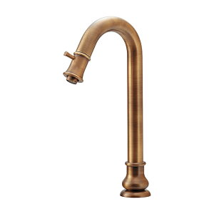 取付穴径22〜27ミリ・厚5〜35ミリ。スパウト回転角度360°。カラー:アンティークゴールド。上部:070-000。90°のハンドル開閉で吐水、止水ができる製品です。