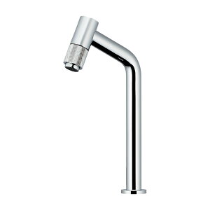 取付穴径22〜27ミリ・厚5〜30ミリ。水栓上部を押すと吐水、自動的に止水します。吐水時間の調整(約5〜15秒)が可能です。角度調節機能付き泡沫。黒塗装仕上げ。