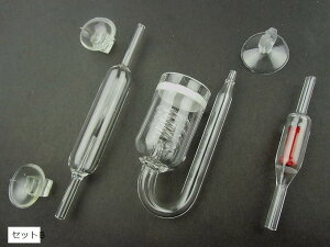 ・「高透明度で美しいガラス製のCO2カウンター、カウンター付CO2拡散器、逆流防止弁の3点セット(セットB)です」・「セットA」と「セットB」の2種類からお選び下さい。・「CO2カウンター」・・本体内のガラス管内を流れるCO2の気泡で添加