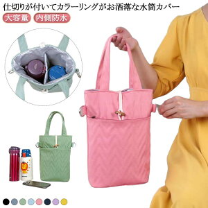 仕切りが付いてカラーリングがお洒落な水筒カバー。ボトル2本入れたり、水筒+お菓子等いれたりできます。内側防水のため万が一漏れたり濡れたりしても安心。スマホやお財布が入る前ポケットもあります。ボトルを守るだけでなく持ち運