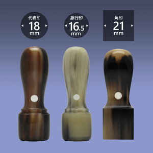 osn-3e ■商品構成 代表印・・・丸天丸18ミリ 銀行印・・・丸天丸16.5ミリ 角印・・・・角天丸21ミリ (ケースは別売です) ■印材説明 東南アジアなどに広く分布する水牛の角を加工した印材です。 その昔、原産国がオランダの植...