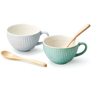 【たっぷりサイズのスープカップとスプーンのセット】稜線を際立たせた模様が美しい「しのぎ模様」のやさしい風合いが魅力のスープカップです。具沢山のスープやシチューにぴったりな容量410mlです。大きな取っ手が持ちやすく、カフェ