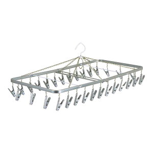 清潔で丈夫なアルミフレームのピンチハンガーです。 【特長】 ◆ 室内干しに便利なコンパクトサイズです。 ◆ 汚れもサッと拭き取れ、軽くて丈夫なアルミフレームです。 ◆ 直径最大約4cmの太いポールや、ロープ、カモイにも掛けられます