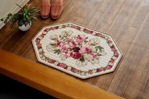 八角形の玄関マット「クラシックローズ」は、エレガントなバラのデザインが魅力です。高級感あふれるこのマットは、室内の雰囲気を一気に華やかにしてくれます。50x70cmのサイズは、玄関にぴったりで、使い勝手も抜群。滑り止め加工が施