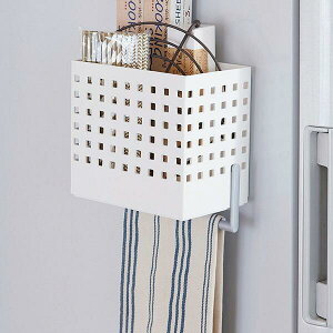 ●便利なタオル掛け付き!すっぽり入る深型の収納かご。マグネット式で、冷蔵庫や洗濯機などにも。出し入れがしやすく見た目もスッキリ。冷蔵庫サイドでは、ラップやアルミホイルの収納に。洗濯機サイドでは、洗濯バサミや部分用洗剤