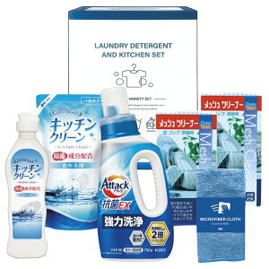 アイテム詰合わせ。贈り物に最適なセット材質●クロス=ポリエステル80%・ナイロン20%内容●花王アタック抗菌EX本体750g・キッチンクリーン250ml・キッチンクリーン詰替200ml・マイクロフ...