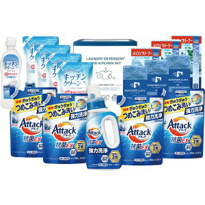 花王洗剤と共に生活に役立つアイテム詰合わせ。贈り物に最適なセット●花王アタック抗菌EX本体750g・キッチンクリーン250ml×各1、マイクロファイバークロス(約20×20cm)・メッシュクリーナー×各3、キッチンクリーン詰替200m...