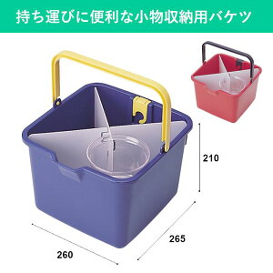 ●サイズ W260×D265×H210mm ●重量 713g ●容量 バケツ:約9L、小物入:約600ml ●材質 バケツ:ポリプロピレン、ホースホルダー:ABS樹脂、小物入:スチロール樹脂、仕切板:ポリプロピレン ●規格色:青・エンジ
