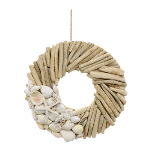 ※画像はイメージです。商品タイトルと一致しない場合があります。流木と貝殻を貼り合わせたおしゃれなリース。扉や壁にかければ海を感じるインテリアに。※天然素材の