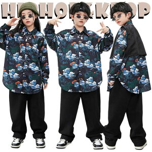 和風 柄シャツ 浮世絵 キッズ ダンス衣装 セットアップ ネイビー ブラック かっこいい 長袖シャツ トップス ベスト ゆったりパンツ ジャズダンス ジャズダンス ヒップホップ おしゃれ